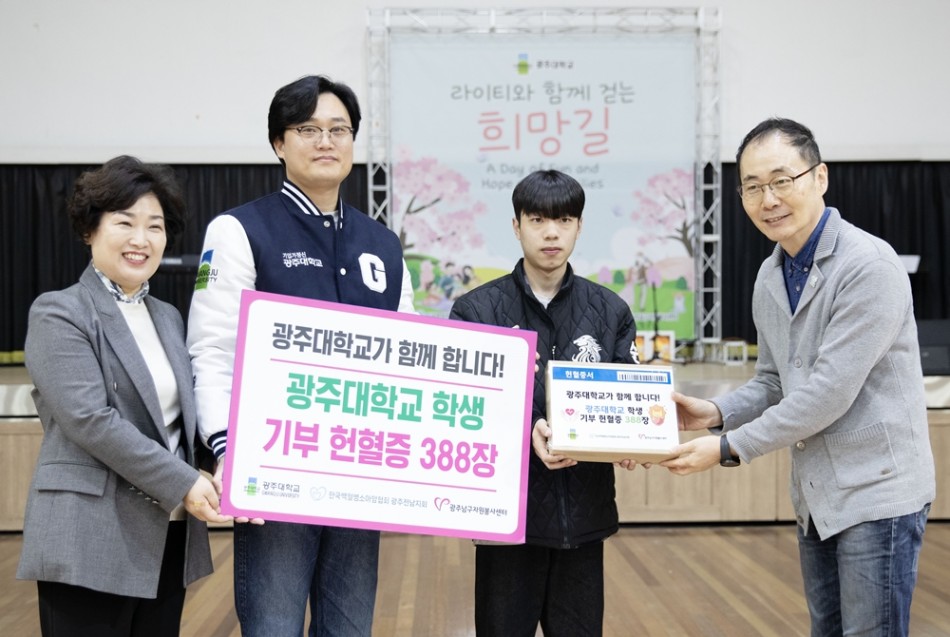광주대 체육관에서 열린 ‘라이티와 함께 걷는 희망길’ 행사에는 백혈병 및 소아암 환아와 가족을 비롯해 광주대 김동진 총장과 학·처장단, 재학생, (사)한국백혈병소아암협회 광주전남지회와 광주남구자원봉사센터 관계자 등 150여 명이 참여해 스포츠 한마당, 레크리에이션, 다양한 체험부스를 함께 즐겼다.