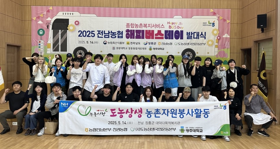 광주대학교(총장 김동진) 호심사회봉사단은 지난 14일 전남 장흥군 대덕읍에서 농협중앙회 전남지역본부가 주관한 ‘전남농협 해피버스데이’ 농업인복지서비스 봉사활동에 참여해 지역 농업인을 위한 다양한 재능기부 활동을 펼쳤다.